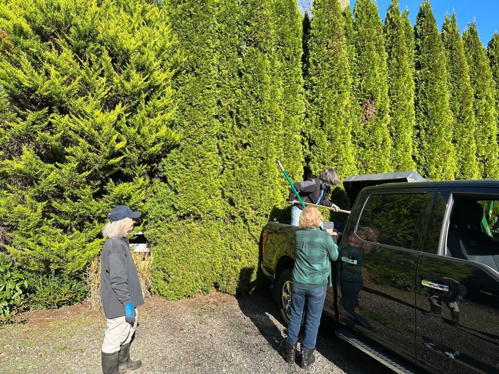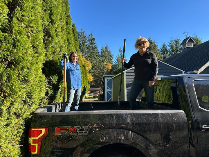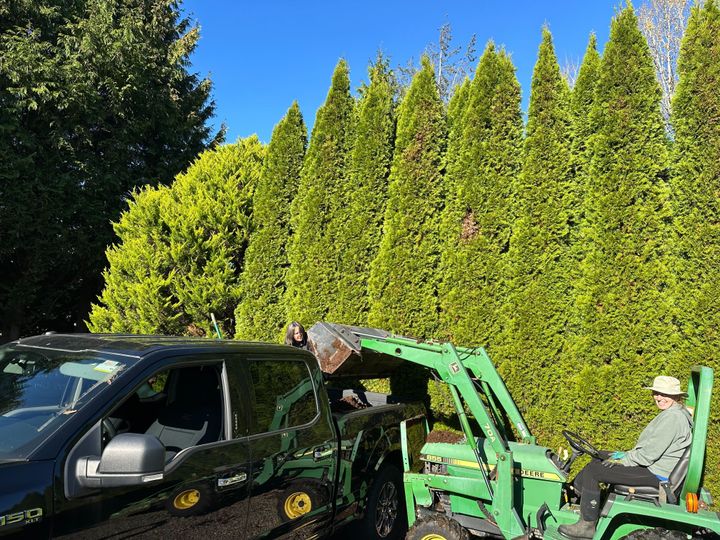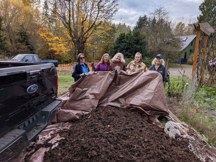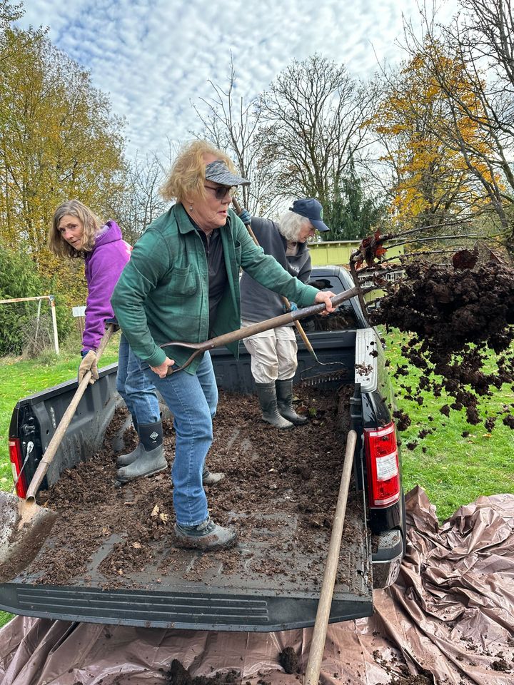 Finally, after many weeks of trying to coordinate schedules, @Angie and @Beryl and the three of us drove to a Woodinville former horse farm owned by a friend of Angie’s, who used her tractor to load 1-1/2 to 2 yards of well-composted horse manure into Beryl’s truck. (Thank you for driving and for the use of your truck, Beryl!) When we got back, @Pam joined us to shovel out the manure into a tidy pile and help with cleaning out the truck bed. The garden plants will be so happy next season!