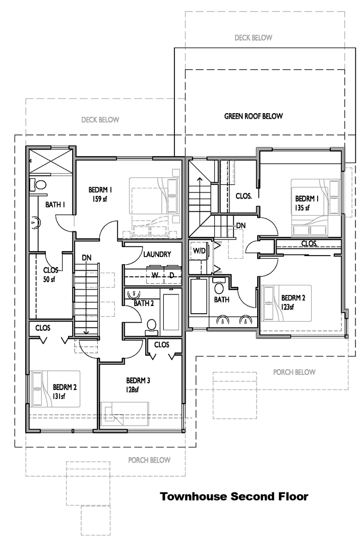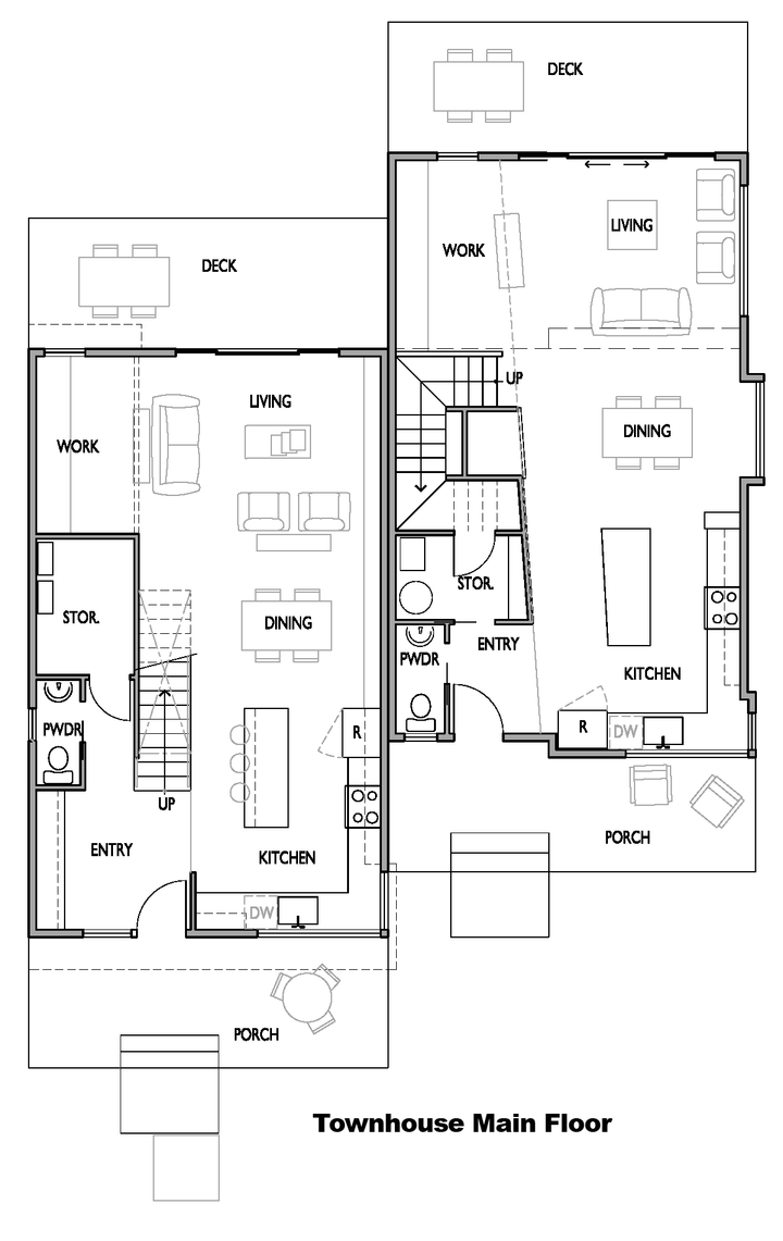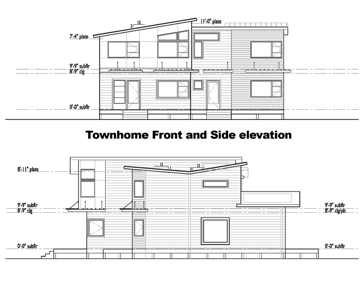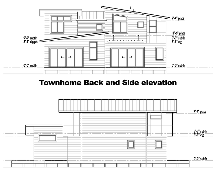 To keep the architectural and construction costs down, we elected to design two basic floor plans and use those for the basis of all the houses on the site. Townhouses are an offset joining of the two designs that will maximize sunlight going into each unit.