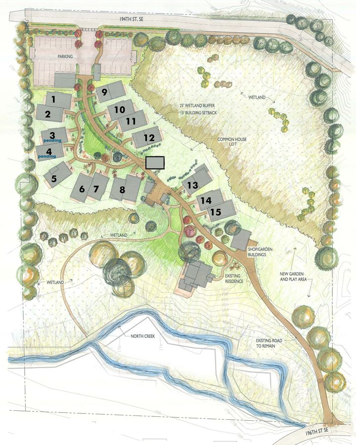 The Clearwater Commons is a Low-Impact Development. Our plans include the building of the community as well as restoring the stream and wetlands on the property to a more natural and native state. Click on the image to see the overall site plan.
